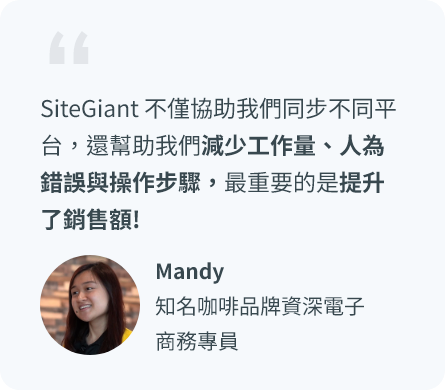 “ SiteGiant 不僅協助我們同步不同平台,還幫助我們減少工作量、人為錯誤與操作步驟,最重要的是提升了銷售額!”