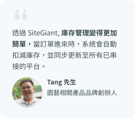 “ 透過 SiteGiant, 庫存管理變得更加簡單,當訂單進來時,系統會自動扣減庫存,並同步更新至所有已串接的平台 ”