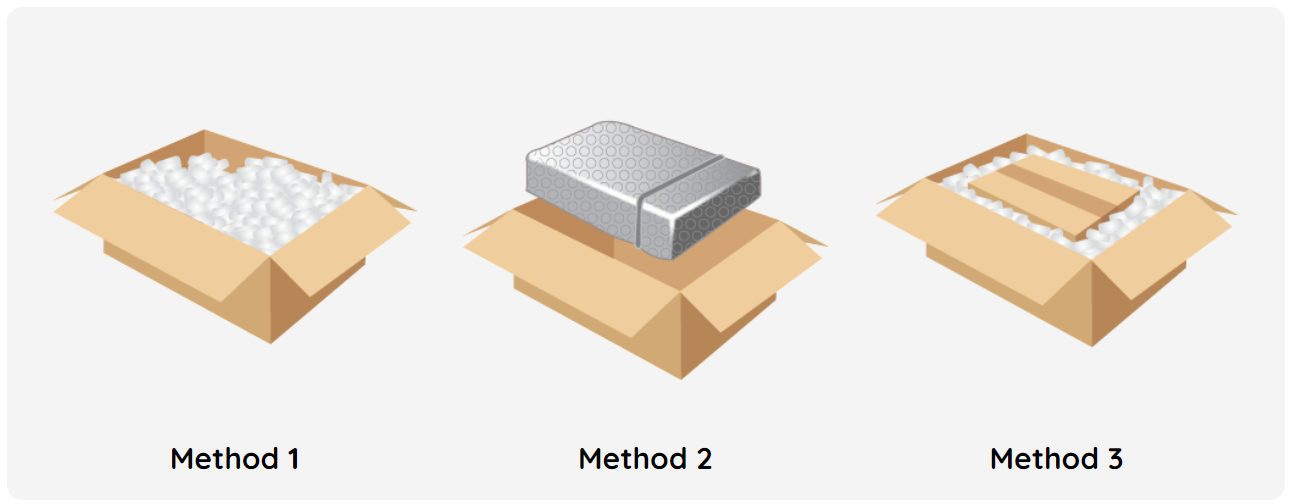 You should first fill the packaging box with foam peanuts or crumpled papers before placing in your item. This is the most common method shipping method used by online sellers. However, this packaging method is suitable for non-fragile products.
