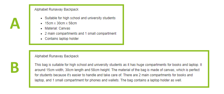 It’s very hard for customers to digest the information if the description is long winded and wordy, so just keep your product description short and simple. Provide details that are important and matters to the customers, and feel free to use other methods such as listing out details in point form, through photos or videos. As shown below, the description in A is very clear and concise while the description in B is very long winded. Try to avoid writing long paragraphs for description as customers will have a hard time fish information from it.