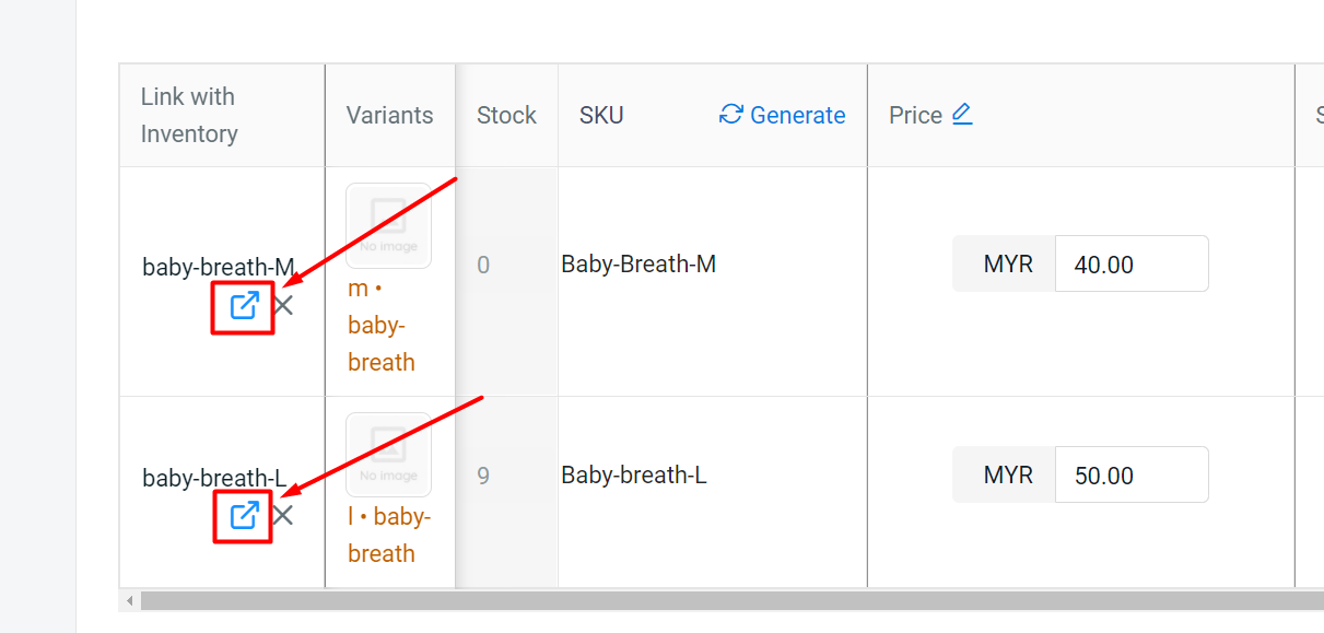 In order to view the inventory that is linked to the product, simply click on the icon (shown below) under the variants section and a new tab will link you to the inventory accordingly.