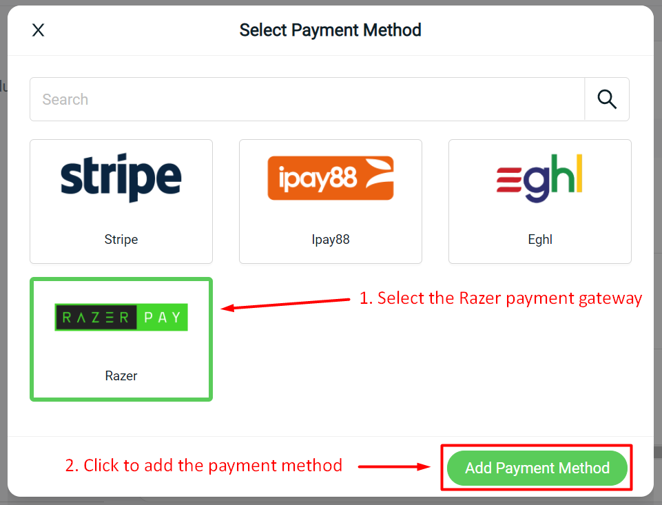 The Razer payment method is also available for your webstore! Simply select the Razer payment gateway and add it to allow your customers to make payments through Razer.