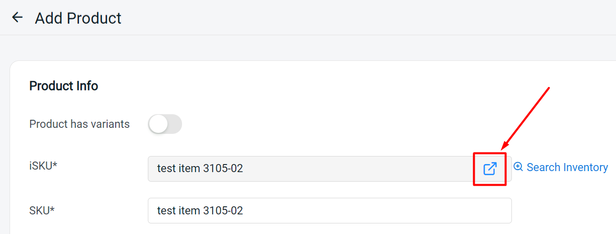 In order to view the inventory that is linked to the product, simply click on the icon (shown below) at the iSKU section and a new tab will link you to the inventory accordingly.