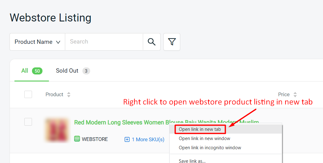 Utilize the SKU Filter in your webstore listing to display results for both parent SKU and variant SKU.