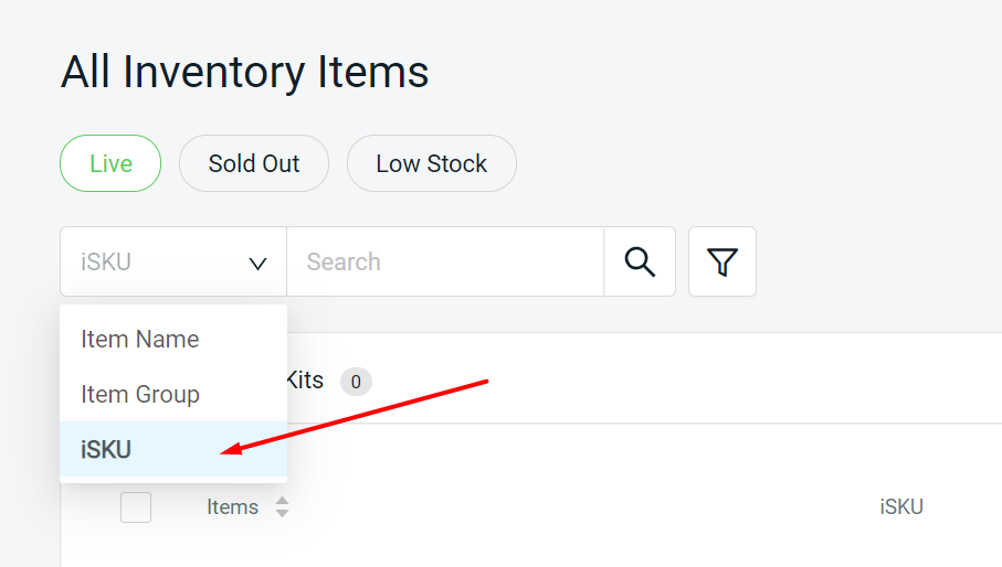 The iSKU filter has been moved to the search section of the All Inventory Items page.