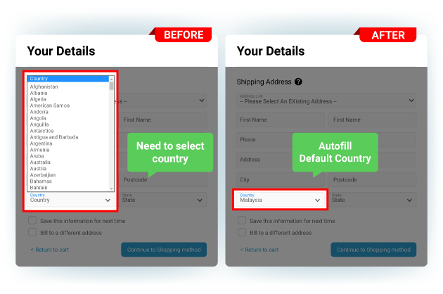 A lengthy customer checkout process may deter customers from making a purchase. To simplify the customer checkout process, you can now preset the default country where the majority of your customers come from. With this setting, your customers will only have to fill in their address and state without having to scroll and select their country. It would definitely save their time and effort.